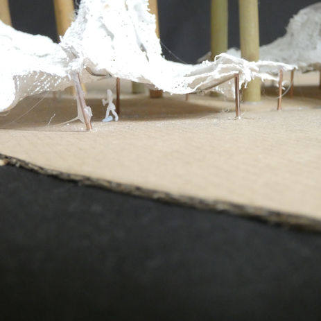 This project took place on the site of the Temple Church in Bristol. The brief outlined a scenario where I was commissioned to design a pavilion. This pavilion was meant to contain a public bar, but due to the complications of the COVID-19 pandemic, this was not possible. Due to the listing of the existing building, I decided to use the gardens that are a part of the site. I designed a modular form inspired by tensile structures for my pavilion. I used this modular form 7 times to create a sheltered area for seating and socialising. The material I would choose for these modular forms would be a PVC coated polyester fabric with a perforated pattern. The aim of this pattern would be to mimic the light coming through a tree canopy. I also designed a glass surround in certain areas to lessen the effects of the elements.
